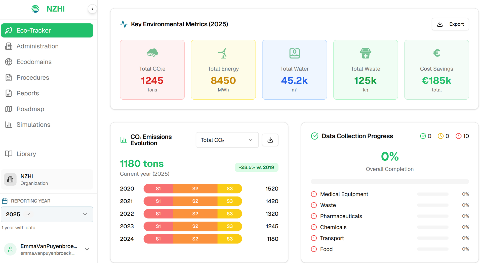 With NZHI, we have developed an all-in-one software solution designed to help hospitals collect, visualize, and monitor ESG data. Our platform supports the entire scoping process, from data collection to reporting.